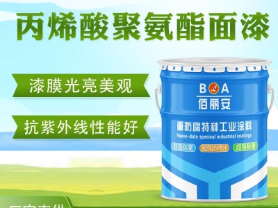 亿展漆业佰丽安涂料生产的丙烯酸聚氨酯防腐漆具有优良的物理机械性能,耐化学药品性,耐盐雾性,可有效耐弯折,漆膜颜色多样,各种颜色均可调制,漆膜光泽丰满,亮度高具有很好的装饰性。颜色多样性,白,灰,黑,绿,兰,红,黄各种颜色,可根据需求定制